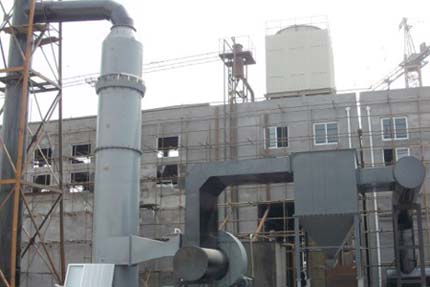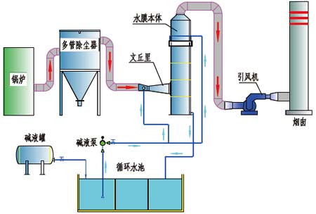 从陶瓷多管除尘器出来的烟气进入文丘里一级脱硫除尘装置。在文丘里中设置了多个雾化器,在文丘里内由于喉部的缩放作用,烟气流速由慢到快再到慢。烟气在文丘里缩放的同时与设置在文丘里内的雾化器喷出的碱性液滴混合,废气中的细小尘粒被气雾湿润而凝聚,使其密度增大,在离心力的作用下,比较均匀地切向进入二级除尘脱硫装置,粒径较大的烟尘及湿润凝聚的烟尘被分离出来,在此过程中,高温烟气得到冷却,并且脱除部分二氧化硫。进入二级除尘脱硫装置内的废气由于切向作用,沿内壁螺旋上升,在上置的溢流水槽中溢出的水与螺旋上升的气体逆向碰撞,洗刷融化,延长烟气与吸收剂的接触时间,使二氧化硫和脱硫剂充分反应,从而脱除烟尘和二氧化硫,脱硫后吸收液落入二级除尘脱硫装置底端,从溢流口溢出到循环沉淀池,在沉淀池灰水分离后再继续回用。 |