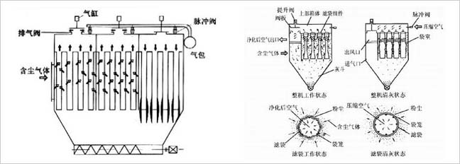 气箱式脉冲袋收尘器由不同室数和每室的不同袋数,组成多种不同规格。每室的袋数有32、64、96和128袋四种。全系列共有33种规格,滤袋直径均为130mm,滤袋长度有2450mm和3060mm两种。本系列收尘器能负压或正压操作,其本体结构无任何改变。其收尘效率可达99.9%以上,净化后气体的尘浓度小于100mg/Nm3。